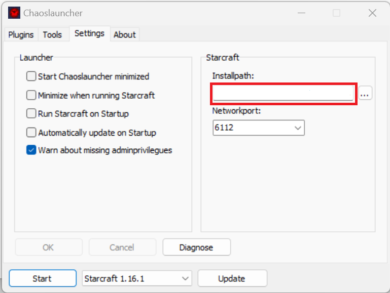 Settings에서 스타크래프트 폴더를 지정하고 BWAPI 4.4.0 Injector[RELEASE]를 선택한다.