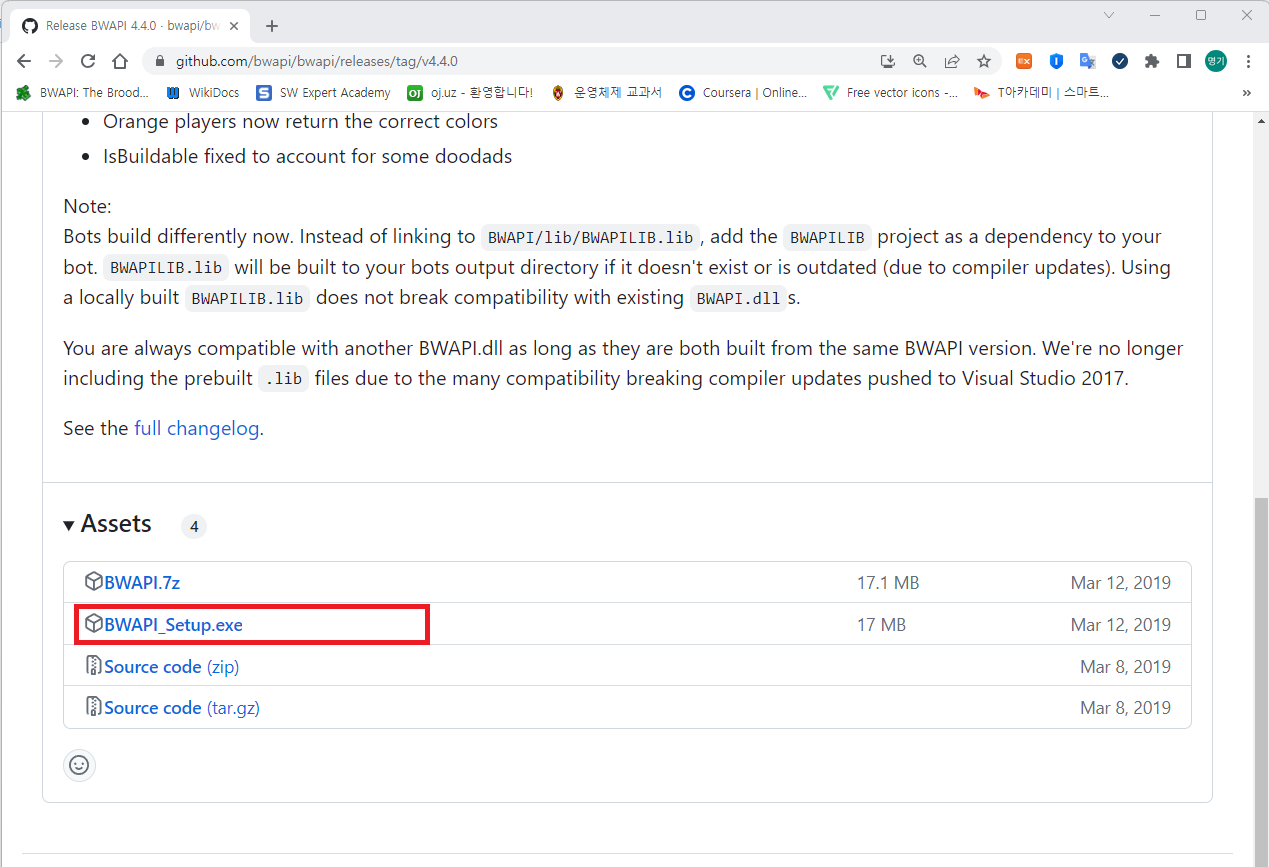 릴리즈에 들어가서 BWAPI_Setup.exe를 다운받고 실행한다.